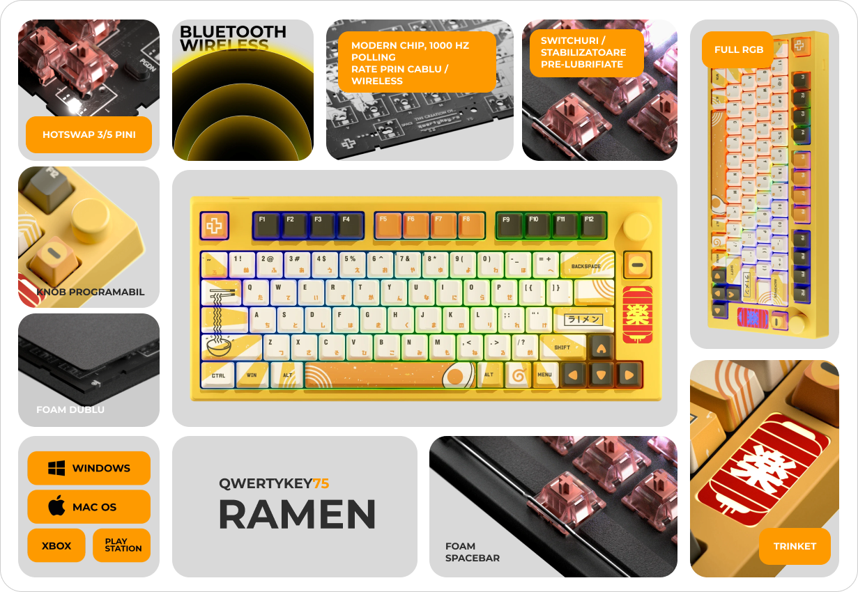 Tastatura QwertyKey75 Ramen Bluetooth Wireless Hotswap RGB Gasket Mounted are caracteristici cheie: