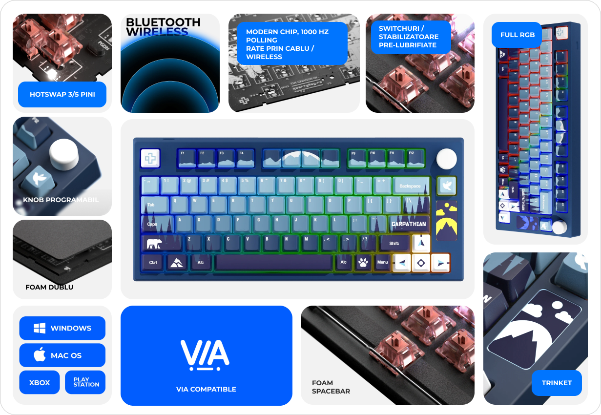 - Trei Variante Unice: Terminal, Carpathian si Samurai cu design unic al tastelor PBT DYE Sub pentru o experiență memorabilă. Carpathian vine cu un set de taste cu profil OEM.
