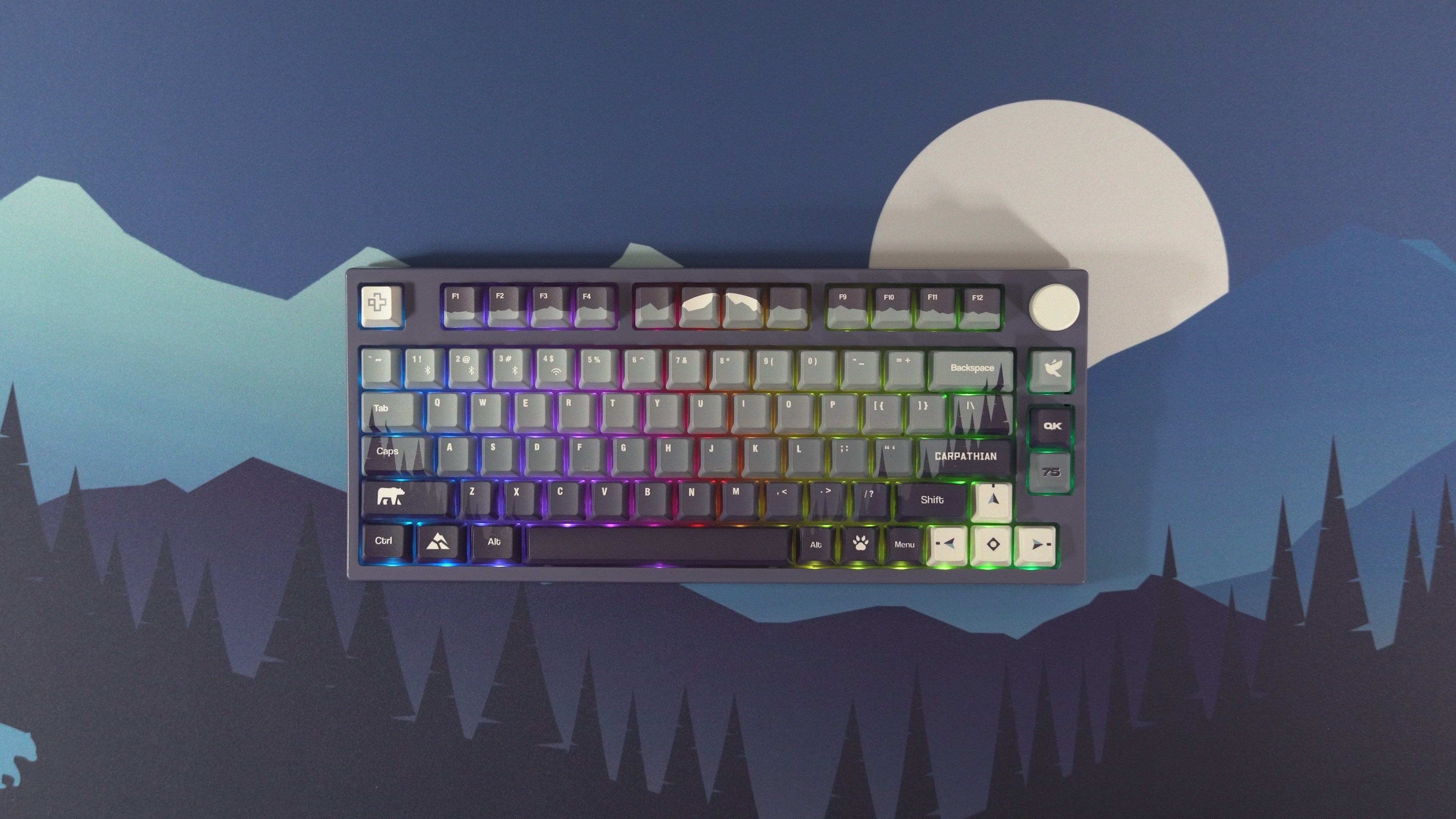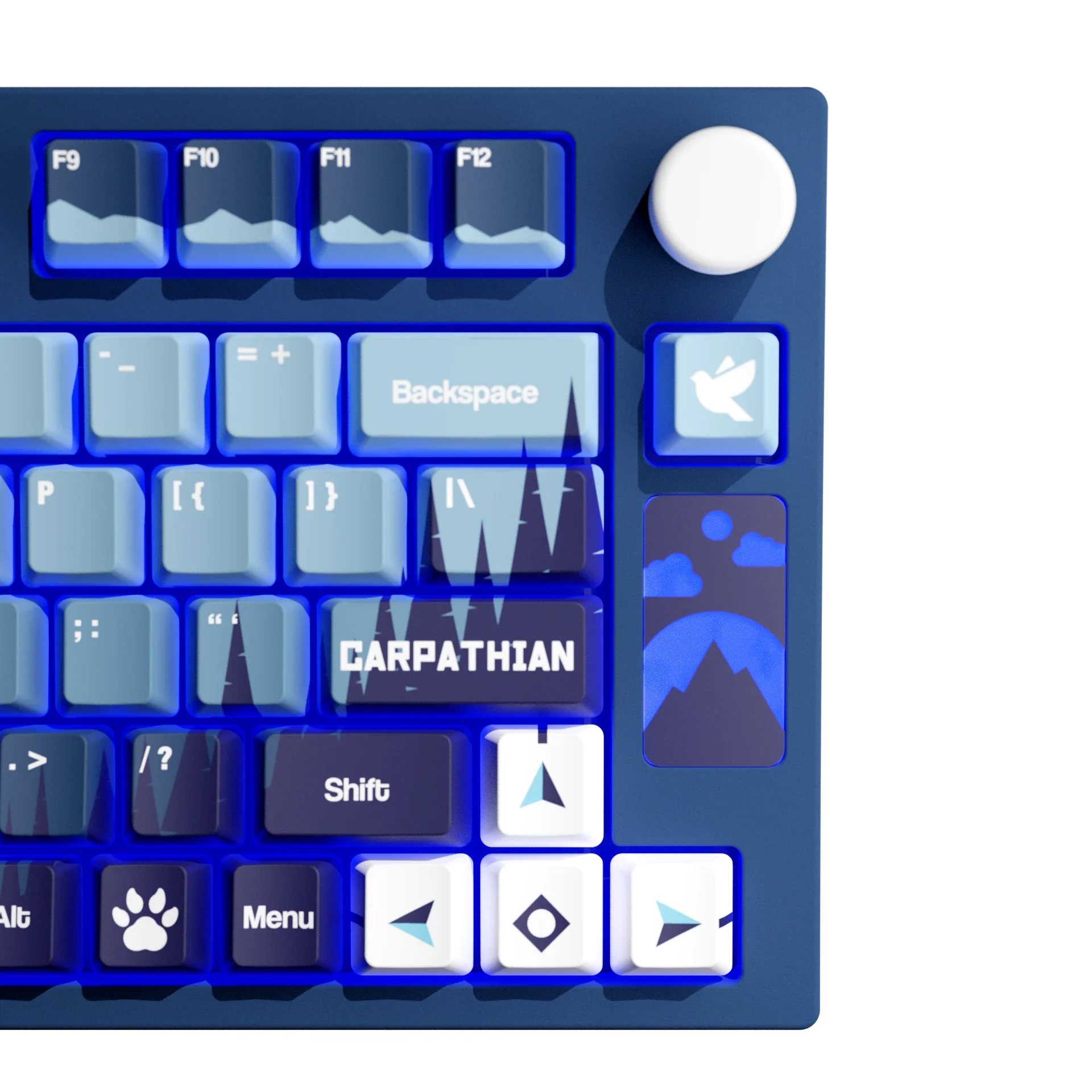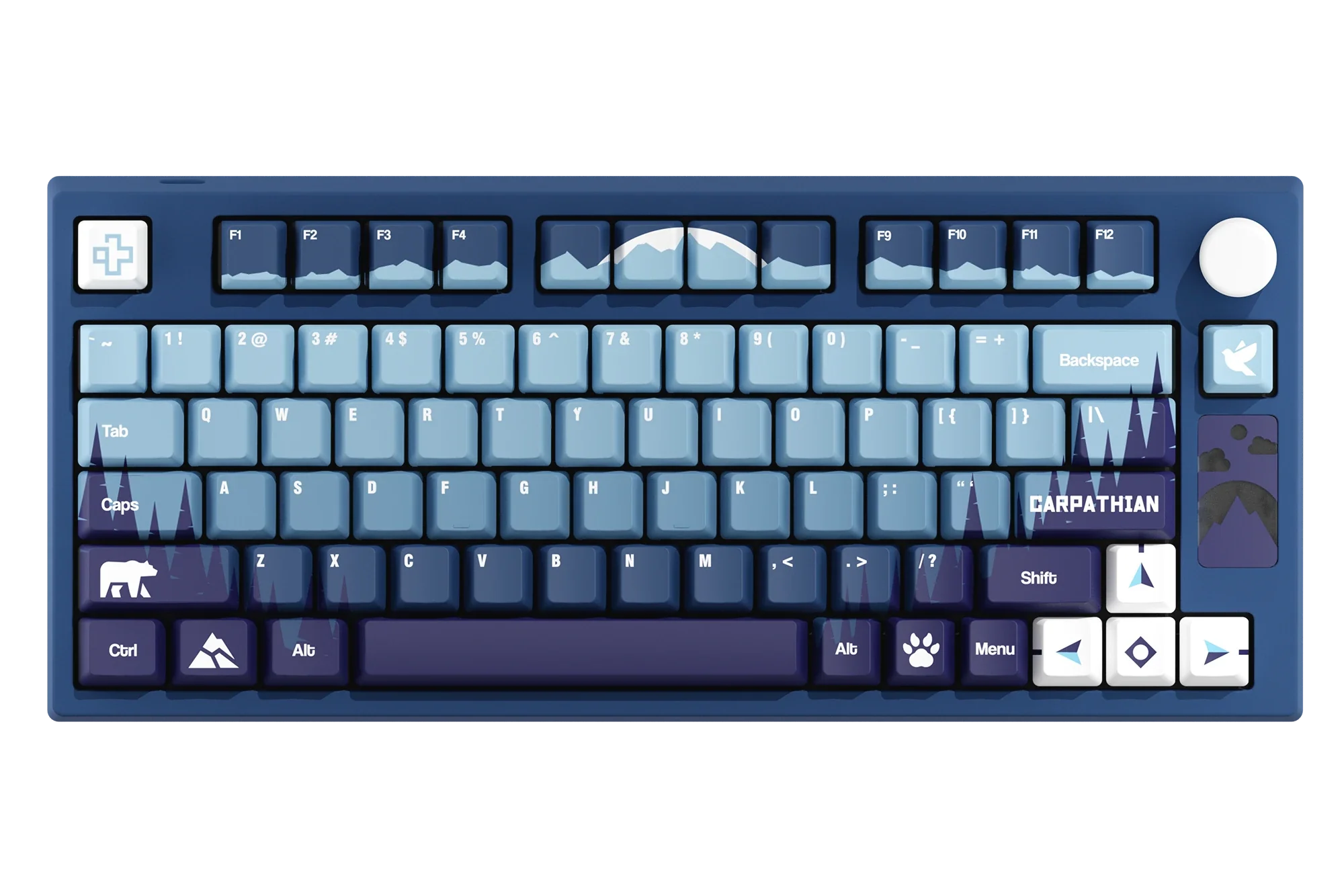 QwertyKey75 Carpathian prezintă un design elegant inspirat de Munții Carpați, cu keycaps în nuanțe de albastru care ilustrează peisaje montane, păduri și animale sălbatice. Carcasa albastră completă este evidențiată de iluminarea RGB subtilă, oferind un aspect modern și rafinat. Ideală pentru cei pasionați de natură și estetică minimalistă.