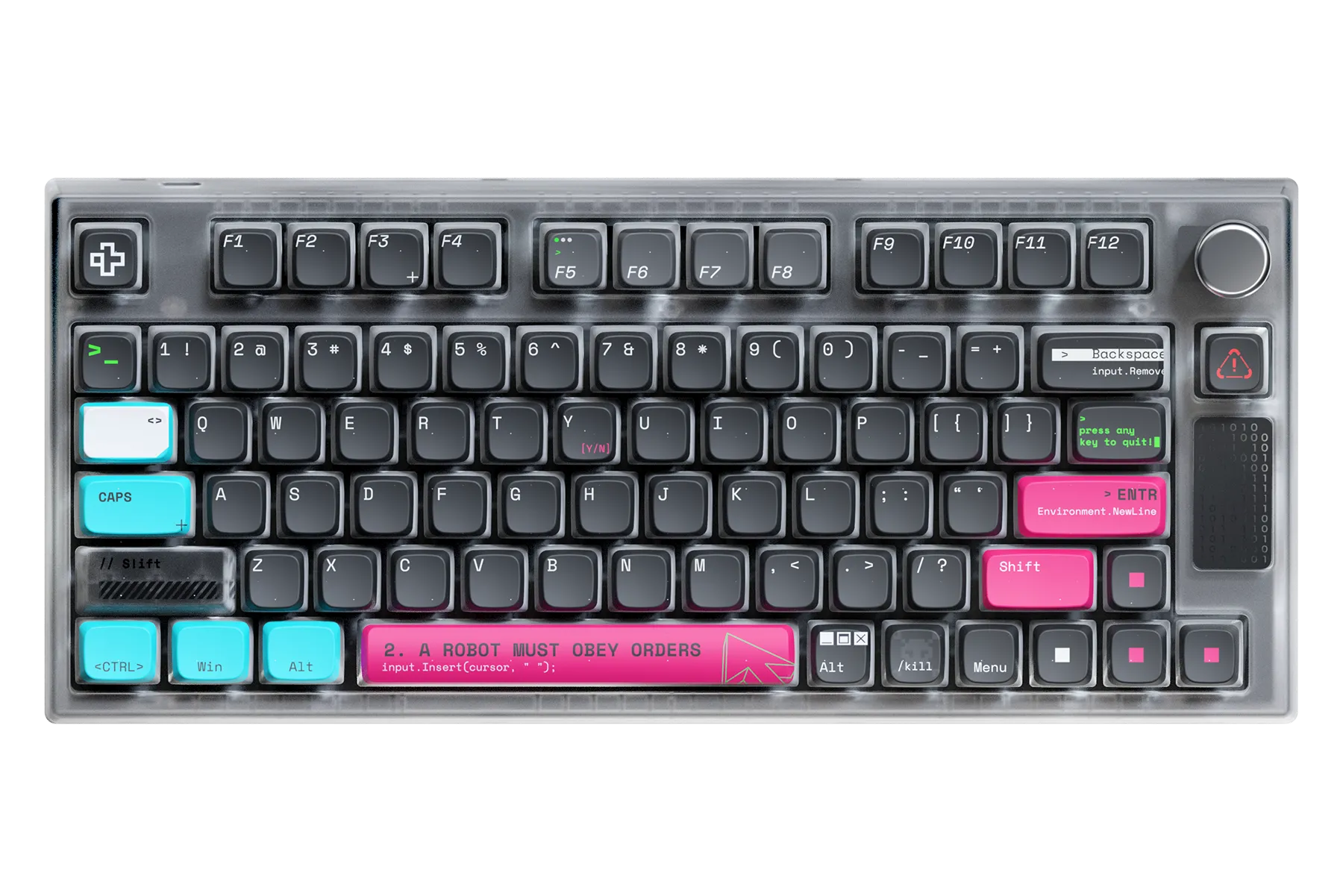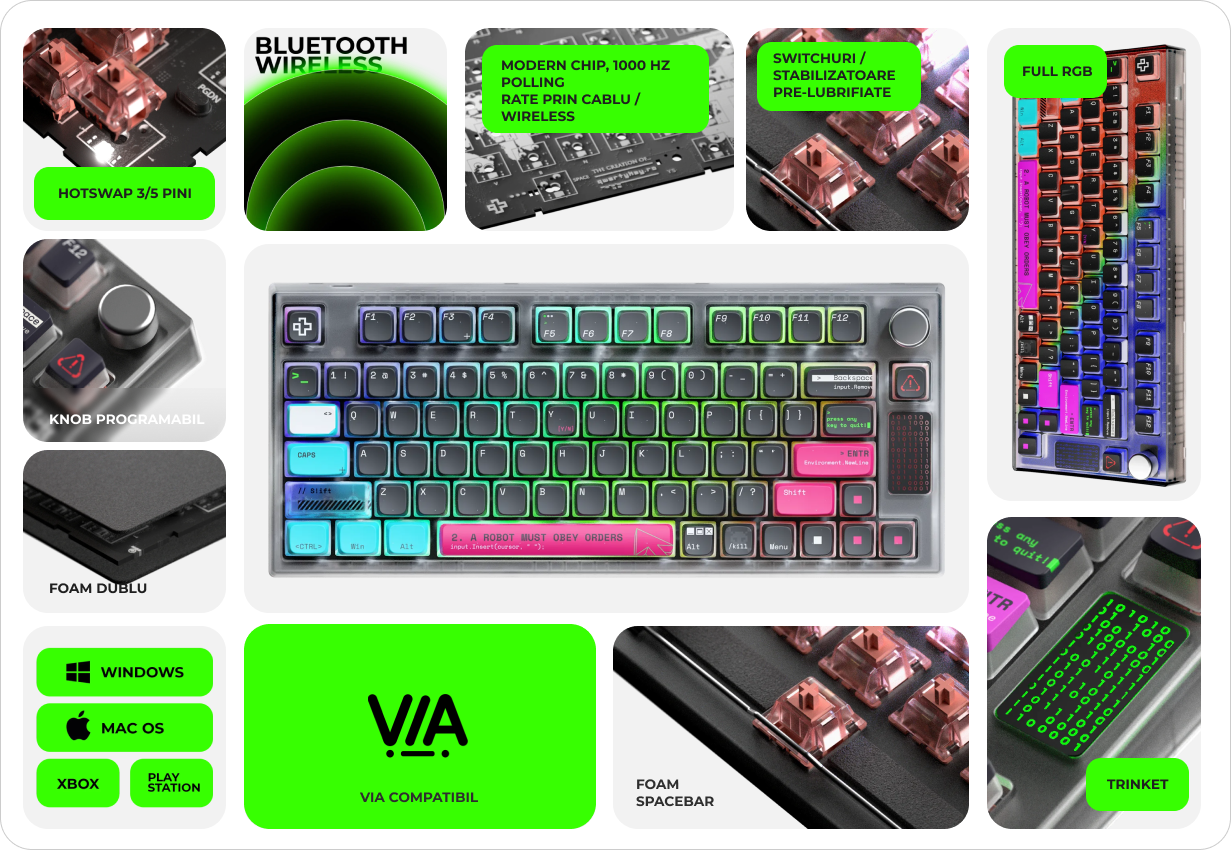 QwertyKey75 are un design inspirat de tehnologie și inteligența artificială, cu keycaps negre și accente vibrante de roz și albastru. Mesaje tematice precum „A robot must obey orders” și simboluri high-tech completează estetica. Carcasa transparentă și iluminarea RGB adaugă un efect modern și dinamic, perfect pentru pasionații de sci-fi și inovație.