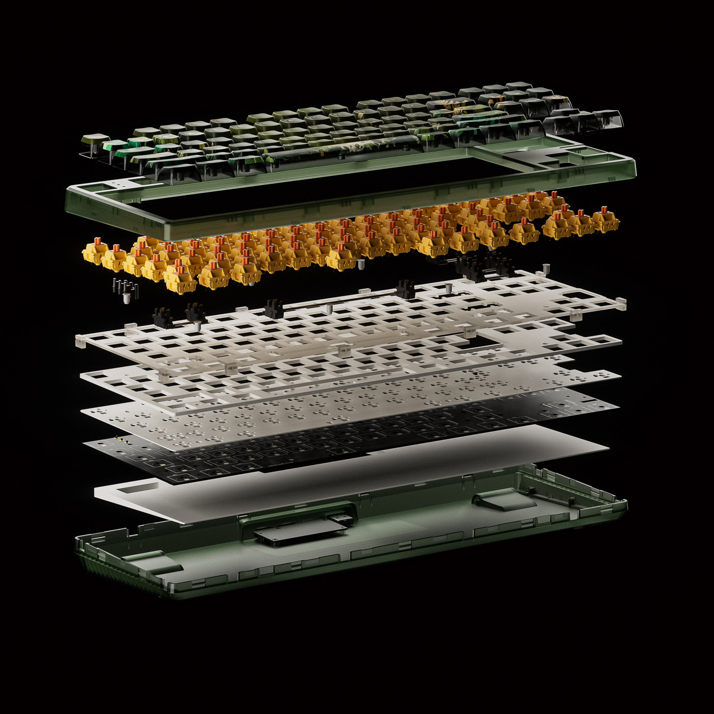 Gasket Mount: Această tastatură utilizează un sistem de montare pe garnituri, care implică montarea PCB-ului cu garnituri moi ce îl amortizează împotriva carcasei. Acest design oferă o senzație de tastare mai moale și îmbunătățește acustica prin reducerea vibrațiilor.
