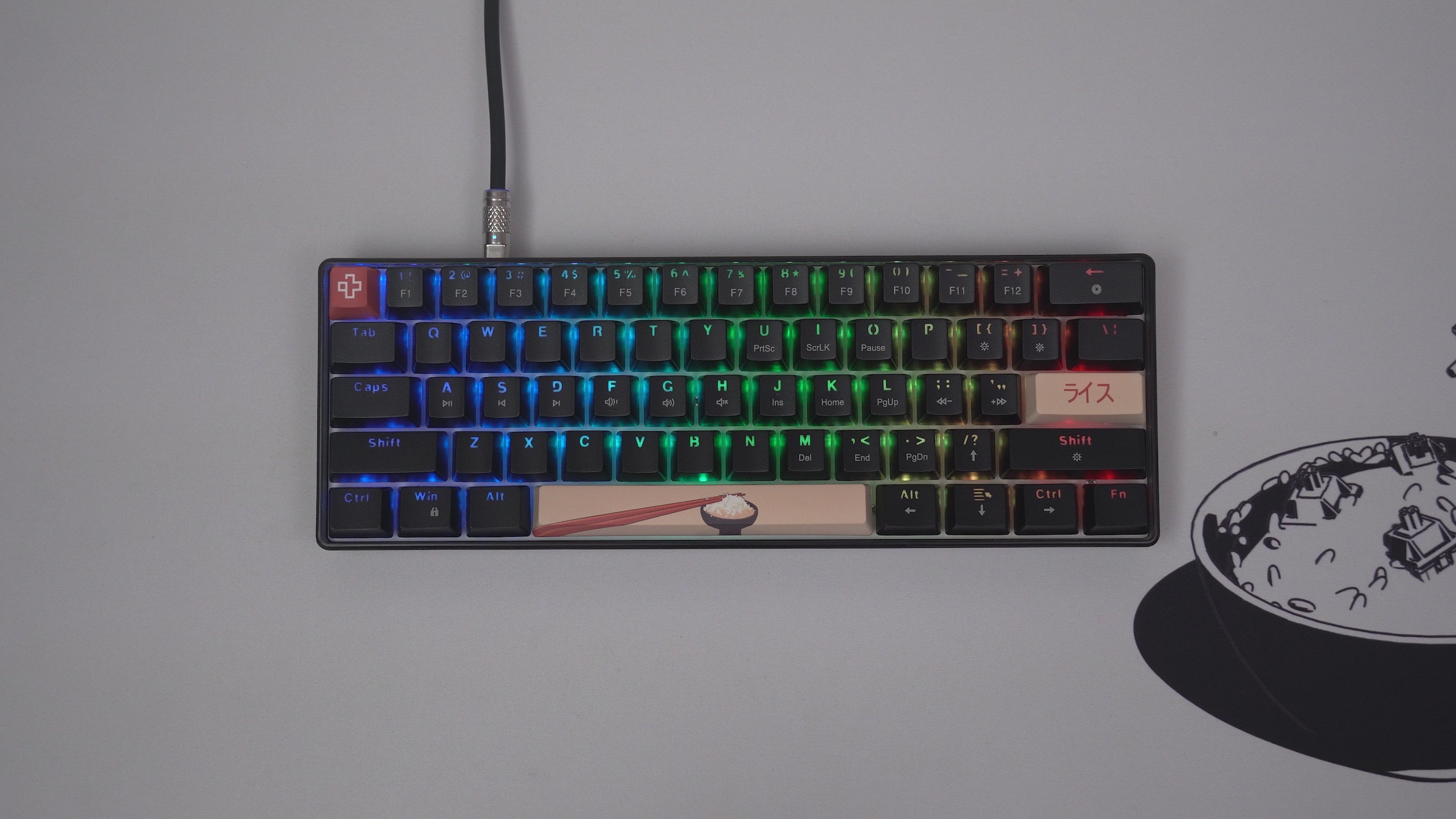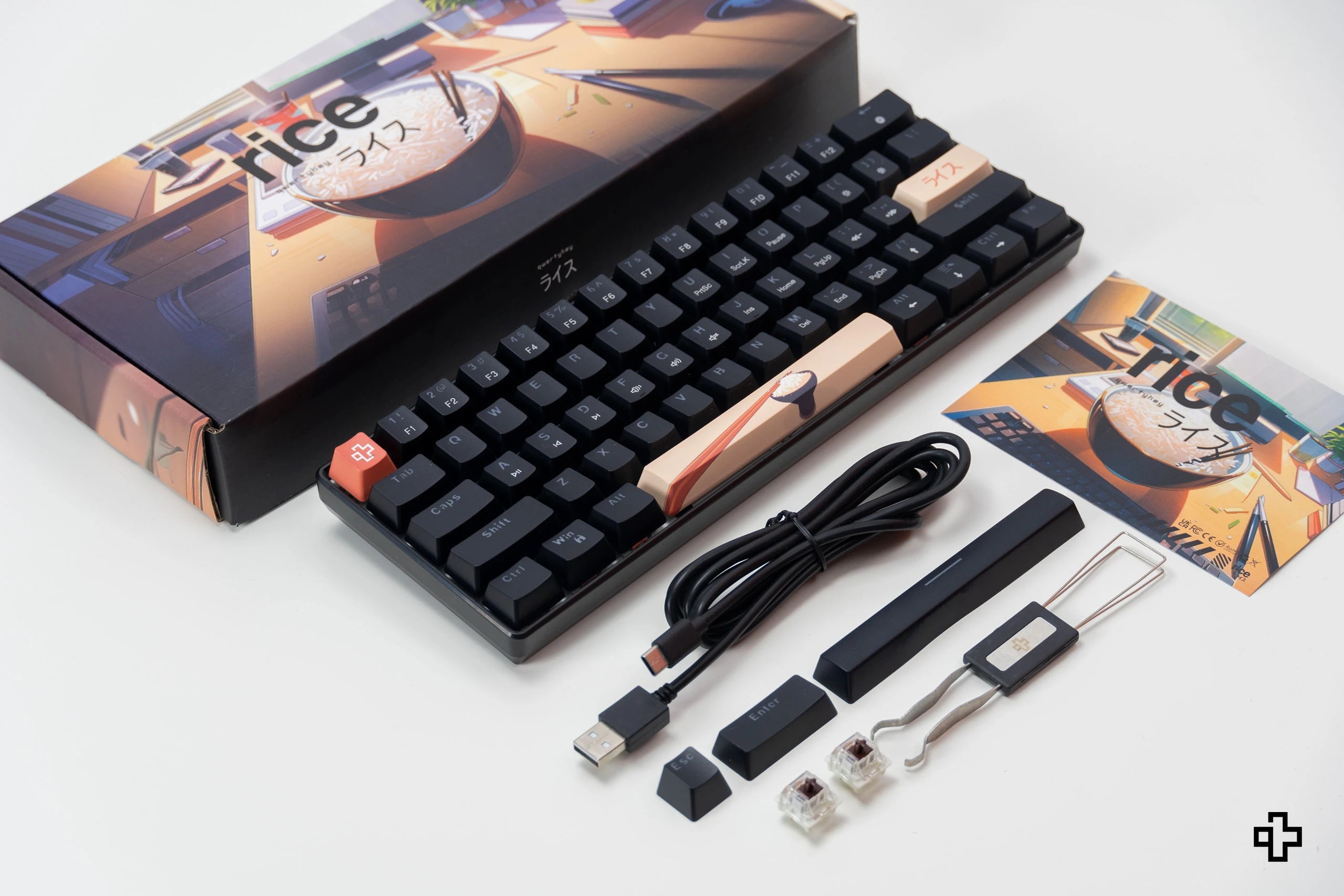 Tastatura "QwertyKey Rice V3" este o tastatură mecanică compactă cu iluminare RGB și design tematic unic. Dispune de taste personalizate, inclusiv o tastă inscripționată cu "ライス" (orez în japoneză) și de o tastă spacebar decorată cu un bol de orez și bețișoare. Ideală pentru utilizatorii care apreciază performanța și estetica distinctivă.