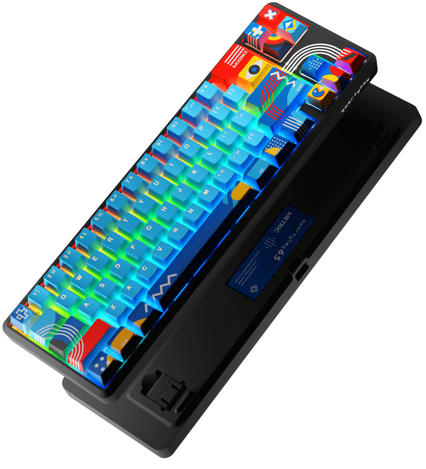 Tastatura prezentată cu numele "Metric" este proiectată cu un stil contemporan, îmbinând elemente geometrice îndrăznețe cu o paletă de culori vibrante și luminoase. Designul său unic include detalii grafice complexe, precum linii curbe, cercuri, triunghiuri și forme abstracte ce conferă un aspect futurist și dinamic