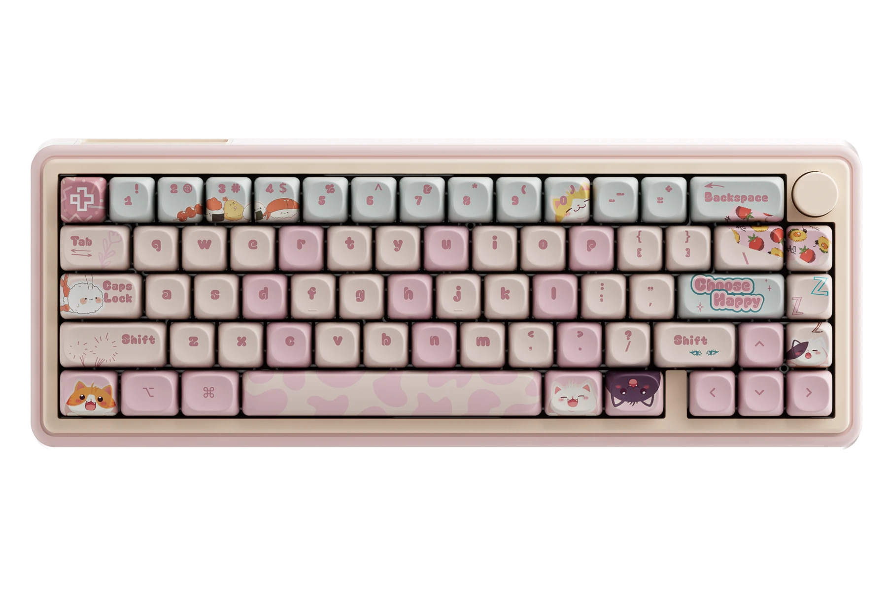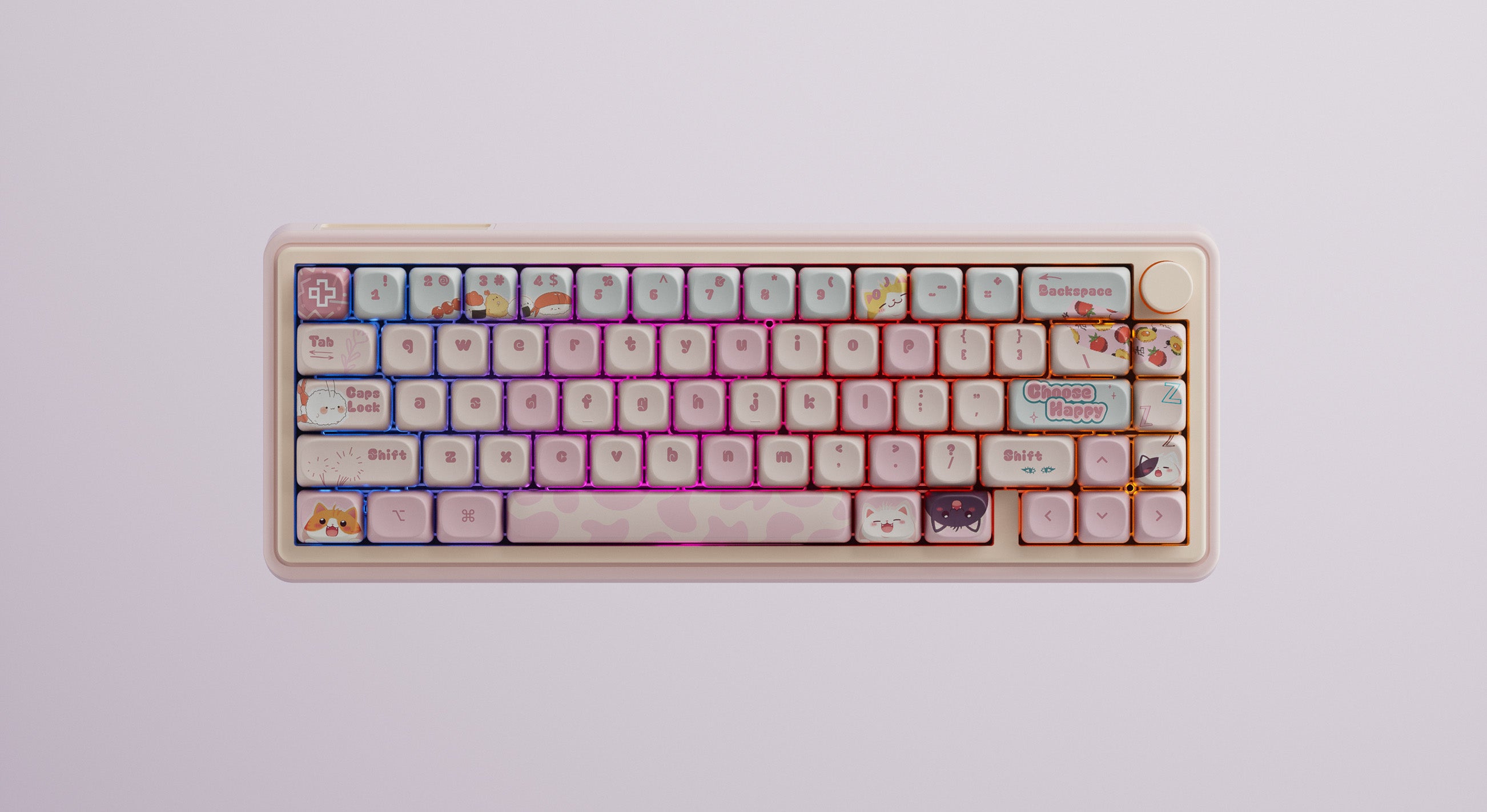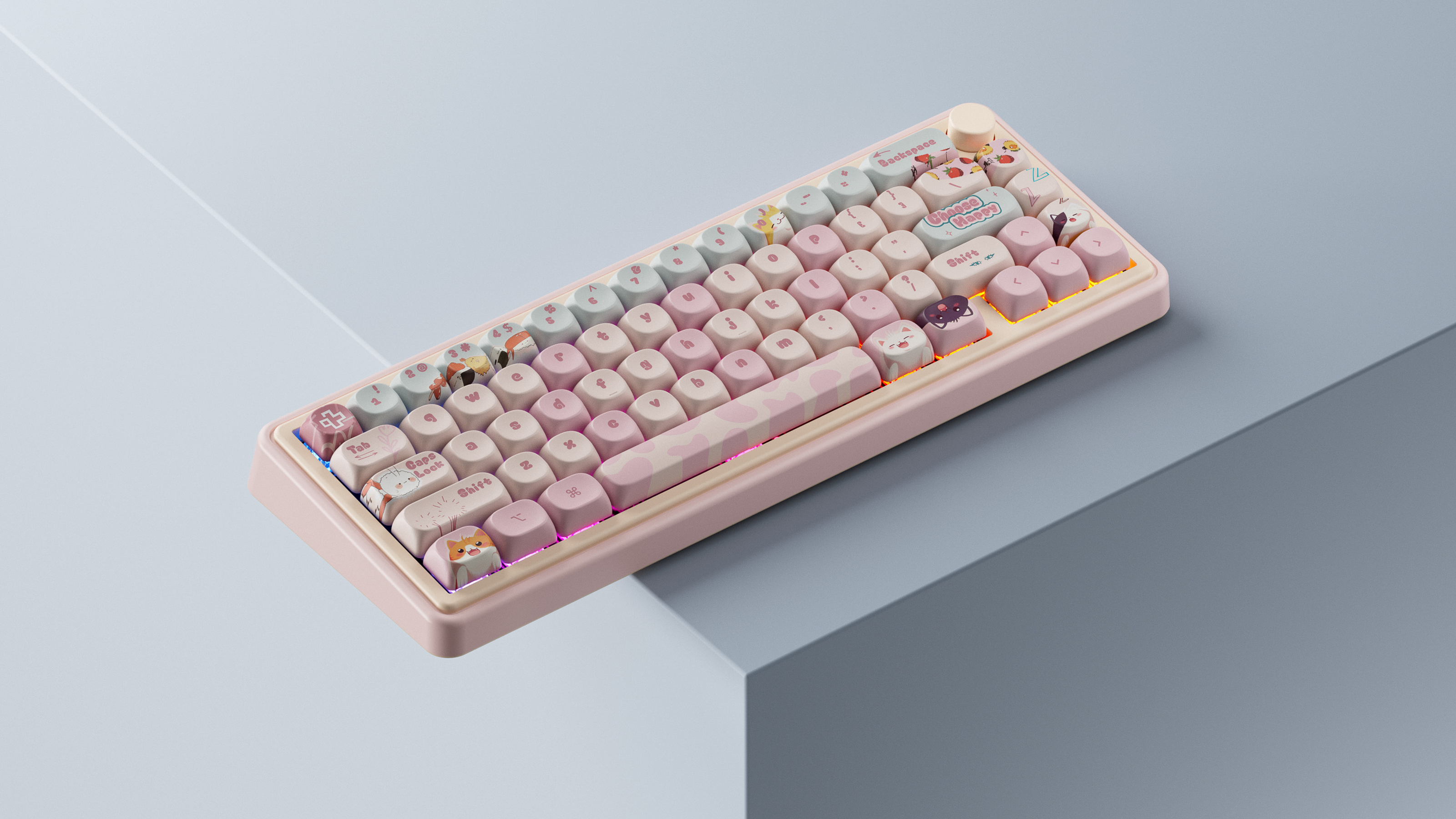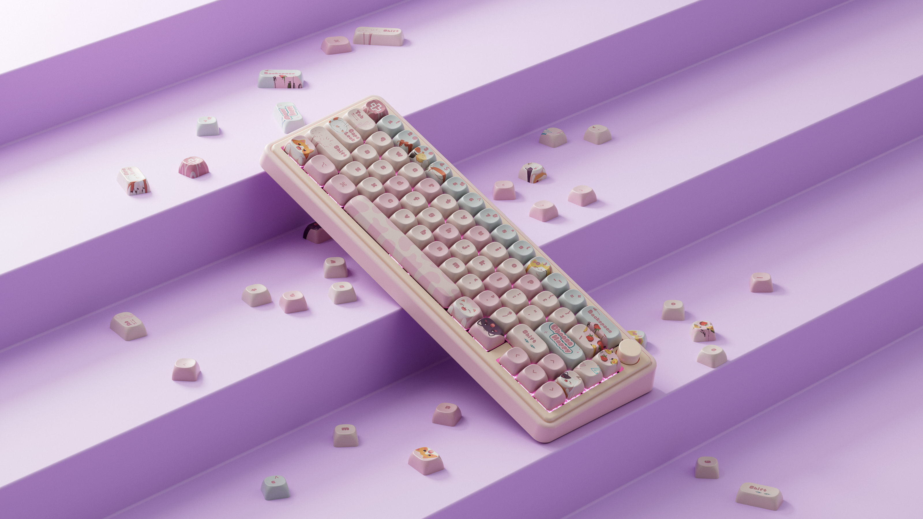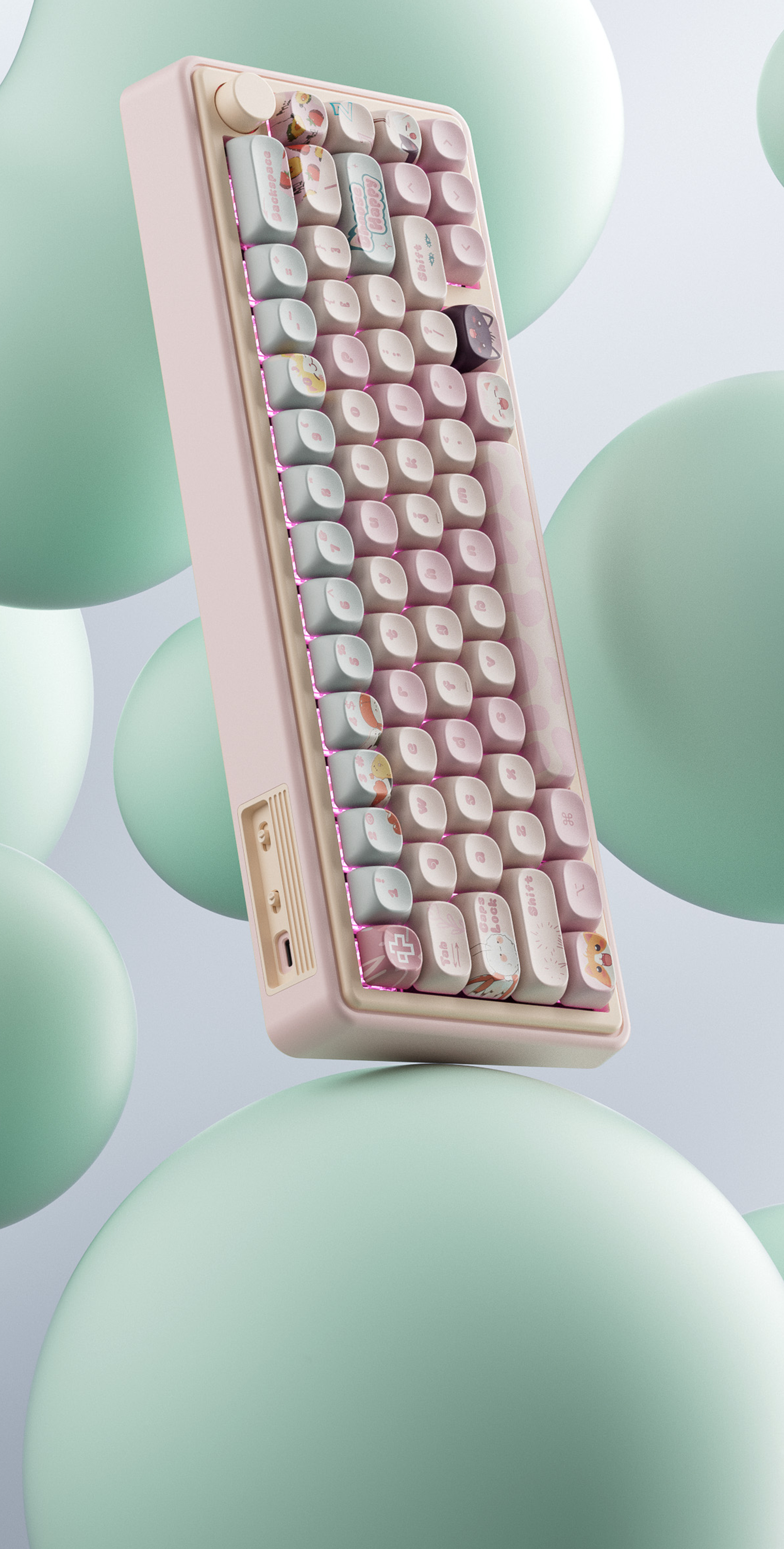 Keycaps-urile în nuanțe pastel și ilustrațiile inspirate din lumea pisicilor adaugă o notă jucăușă, dar păstrează o estetică bine echilibrată și coerentă. Este o alegere perfectă pentru cei care caută performanță, confort și un design care iese în evidență, fără a compromite calitatea construcției.